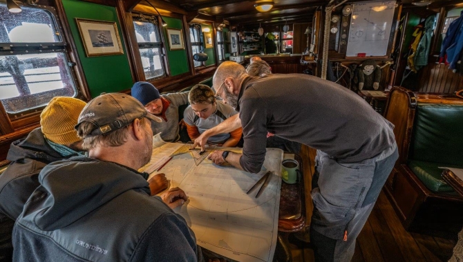 But before we look at celestial bodies, we need to understand the basics of navigation. For that, we base our exercises on coasting. Deckhouse tables become clothed with charts, pens, rulers, and compasses as trainees attempt to plot routes and positions.