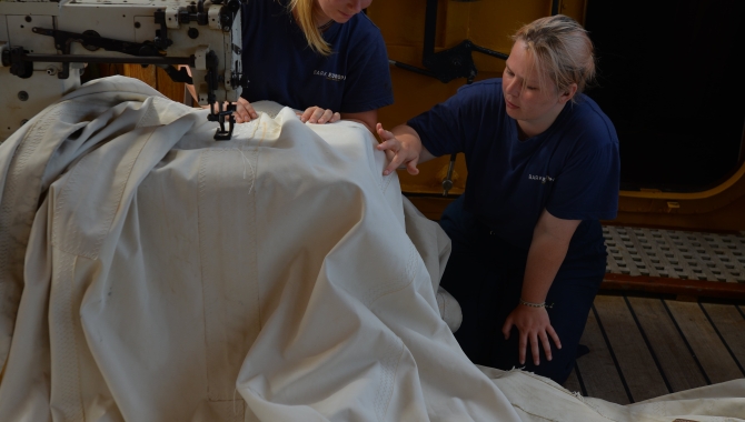 After a dozen of wonderful sailing days, Europa finally docks in Vava’u in Tonga. After the gangway has touched solid ground, the voyage crew is free to roam around and discover the island while the deck crew gets busy; the sails are furled quickly, the tent is rigged above the main deck and the maintenance jobs start. The deckhands are sent in every direction, may it be aloft for some rigging repairs or down below to assist the galley team or the engineering department. On deck, our tasks may involve working with leather, paint, grease, wood or any material that involves some manual care to last longer despite the intense exposition to the ocean’s salty sprays. Our sails are no exception to this.These few days in Tonga, although filled with fun activities like snorkeling and feasting with friends, are a good opportunity to lower some sails on deck. While sailing, small sail repairs are easily possible but it takes very calm and stable conditions to get our heavy duty sewing machine, Freja, out.Freja lives tightly packed in the captain’s cabin, behind wood panels that you could mistake for simple furniture. It takes 4 people to lift her and another person to align the foot of the machine with its upper part when lowering it. It also takes a good amount of knowledge and patience to operate Freja as she does not hesitate to let us know when we went a bit too far with the thickness of our project. She’d also like to remind the crew that she loves oil, thank you very much.Today, the main reason to drag Freja out of slumber is to give some love and attention to Desmond. Most of our sails have very standard (and boring) names like a “main topmast staysail”. But Desmond is far too unique to be satisfied by a name so common you could find it on another ship... Abi did mention she has a great-uncle named Desmond... but whatever.Desmond lives behind the lower part of the main mast when it is furled but slides higher and closer to the mizzen mast when it is called to duty. This perilous journey towards the wind implies chafing along other lines, so Desmond was indeed very happy today to receive some attention from Freja.Stay tuned for the next adventures of Freja and Desmond (and all the other sails...)