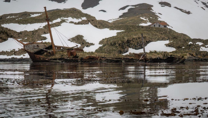 With the station's closing, their coal storage ship Brutus was left behind. Soon, it lost its moorings and ran aground. Here it lies since then. Tussock grass grows on its broken and rusty decks, and the remains of its masts serve as perches for cormorants, seagulls, and terns.