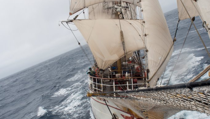 The roughest stretch of water in the world has been more varied then rough this time. Storms are not unusual here – often low after low will pass by in rapid succession. As they approach over the oceans, not meeting land on the way, they built up until they suddenly hit Cape Horn and have to press themselves through the relatively narrow stretch between Patagonia and the South Shetlands. Winds are predominantly from the West. Together with a strong current running clockwise around the continent this makes for some challenging waters. This time however it seems we have caught a low that behaves a bit different. It moves further North than usually, and instead of experiencing the strong Westerlies the last days the wind has shifted from the North to the East to the South. Currently our Square sails are up, we are braced square and ready, just waiting for the wind to increase so we can reach the Horn on these rare, following winds.