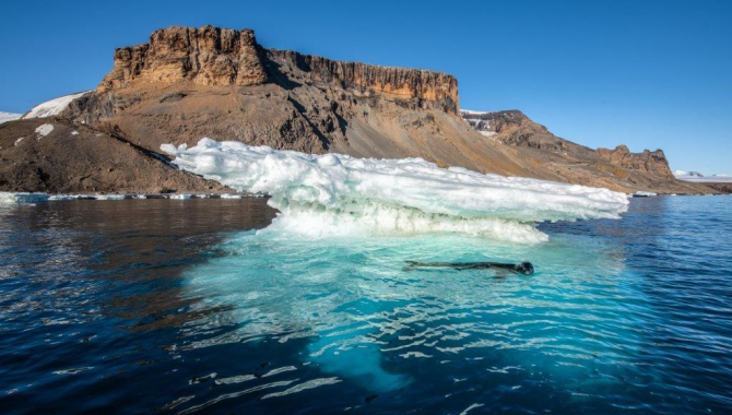 Leaving Duse Bay after sunset we spent the night slowly making our way around the Tabarin Peninsula to reach Brown Bluff in the morning. On the way, Europa encountered some giant patches of sea ice and sailed through Fridtjof Sound dodging some tabular icebergs, which were almost completely blocking our passage. By breakfast time we were already under the large orange coloured cliffs of our planned destination.