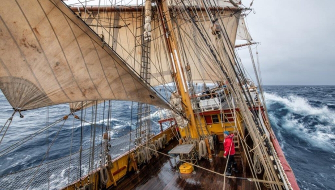 But the weather and sea conditions kept changing, and by lunchtime the wind dropped, calling for setting more canvas again. Soon after Europa sails the Drake Passage under full sail but the upper staysails and Royals. Later the wind seems to stabilize a bit more around a WSW-ly of 20kn and also the royals are set. All an all, a day full of the typical changes offered by the Drake Passage, always challenging for the sailors, since it was first sighted by Sir Francis Drake, the second person to force a route through and circumnavigate the planet in a westward direction, about 60 years after