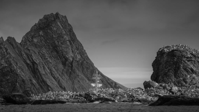 Such a breath-taking place we could enjoy today from our zodiacs, while slowly the sunny weather that welcomed us here early in the morning was changing to an overcast and foggy afternoon. But taking advantage of the fair morning conditions we drove close to calving glaciers and cliffs, rocky outcrops covered with moulting Chinstrap penguins, now busy growing new coats that will last for another year, and approached Point Wild itself. Nowadays the point is home for a sculpture honouring the Chilean Captain of the ship Yelcho, which was the one that after few attempts with other boats, Shackleton could finally reach again Elephant Island on his rescue mission.