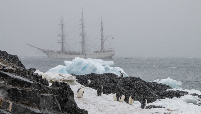 Antarctica. Arrival under sail to the Antarctic Sound. Evening landing at Madder Cliffs-Kinnes Cove A sailing day in the cold fog.The last day at sea after we departed from South Georgia about 11 days ago. A summary of the last hours experiences talks about the damp and cold watches on deck, low visibility, now and then a supposed sighting of land veiled by the mist, often a report of icebergs closeby hiding behind the thick low clouds, repeatedly the Europa cross bands brash ice on her way to the Antarctic Sound. Sails take the fair winds until the afternoon, when getting closer to land it was time to douse and furl them all. Soon in-between rain and snowfall gusts, high cliffs, glaciated slopes and mountainous lands come to sight. With the Europa drifting close to the shallows and stranded icebergs off the West shores of Joinville Island and readying the ship for an evening landing, one could fall in the trap of thinking that busy days on deck, sailhandling, cold watches, icy conditions and all the hardships from the last days were to be the last ones before reaching Antarctica and set foot ashore. But the temperamental Antarctic weather has nothing to envy to the stormy Scotia Sea. Ideally we would set foot ashore straight away on arrival. Weather forecast for the following days let’s say that would advise to do so. Like that, in the wet, cold and grey weather, while it keeps snowing, after an early dinner we all make way in the zodiacs for our first landfall in Antarctica. A channel between the rocks of Madder Cliffs give access ashore. High steep rock walls surround the neighbour Kinnes Cove, a picturesque small bay of Joinville Island (the largest of the archipelago that also includes D’Urville and Dundee), which was discovered as soon as 1838 by the French expedition under Captain Jules Dumont d'Urville, who named it for François Ferdinand Phlippe Louis Marie, Prince de Joinville (1818-1900), the third son of the Duc d'Orléans. To the West, the mainland Antarctic Peninsula, inbetween, the Antarctic Sound, and above us the building up of stormy conditions. Nevertheless, as long as ice, weather and sea conditions show a slight possibility for us to stretch a bit our legs for the first time since leaving South Georgia, we are going to take it. Nobody said that sailing and landing in Antarctica was an easy deal, and today, the real feeling of Antarctic conditions made for a remarkable couple of hours ashore. Increasing snowfall driven by strong winds and reduced visibility didn’t stop us to have our first contact with Gentoo and Adelie penguins, that seem to carpet the lower slopes of the high hills and cliffs behind. Adelie seem to prefer the higher slopes while the Gentoos, many of them already busy taking care and feeding their chicks, prefer the less adventurous lower banks. A good passage between rookeries led us uphill to a vantage point over the rocky coast and Joinville Island ice cap, as the whole island is almost completely glaciated. The worsening weather conditions and the increasing amount of bergy bits and icebergs drifting close, makes for the ship to manoeuvre and brave the blizzard-like circumstances before the boats start their way ashore to pick us up. Now, the narrows amongst rocks where we landed a couple of hours ago are packed with heavy brash ice. Not many other places where to operate zodiacs are around, so its time to put up with weather and ice and take it for a sort of adventurous zodiac ride. Back aboard, we find an Europa making way to the more open waters of the Antarctic Sound, against the wind with snowy slippery decks, icicles starting to grow here and there on the rig, and frozen coils on the pinrails.