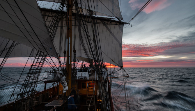 Good evening,POS: 48*02,1 S 053*16,0 WCOG: 120SOG: 5.1 ktsWND: WSW 4 bftSEA: 1.0 meterSWL: SW'ly 2.5 meterWater temp: 9.5Air temp: 9.8Hi all,Waking up all curled up against the side of your bunk, or if less lucky almost falling out, that has been a while. Around 3 am the promised wind reached us with 45 knots. We prepared already, so nothing unexpected. After a bit of bracing the ship got back on track with around 8 knots. The sun was out all day and made it into a perfect sailing day. Beautiful blue water and sky at the same time. Seabirds riding the wind. Jordi and lots of VC taking pictures. Some of us caught a wave and got a "bit" wet...but that is part of the deal! Good practice for what is to come and always good for a laugh by the ones watching and not hit. By the end of the day the wind decreased and now, a couple of hours later, the sea-state calms down as well. We're about to set the royals after our evening coffee time and brace a bit as well.The atmosphere on board is good! People are enjoying the sailing and all that's around; lectures of guides, lectures of the crew, the food and each others company.Groetjes, Janke