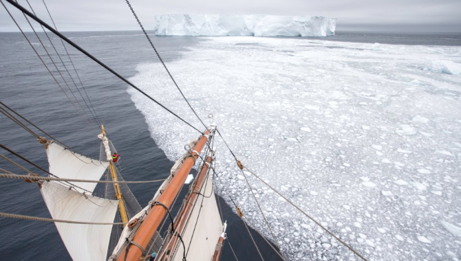 They were trying to determine the position of the South Magnetic Pole. On 11 January, the expedition came to halt in front of an enormous wall of ice. Ross called it the Victoria Barrier, but it is now known as the Ross Ice Shelf. Late afternoon on March 9th, in the North-western corner of the Weddell Sea, more specifically in the Erebus & Terror Gulf -- which is named after those two ships -- we reached a fragment of one of the world’s largest icebergs ever recorded. B-15Y is a "small" portion of what started in March 2000 as B-15 with an area of 31000km2, slightly larger than the size of Belgium. B-15Y is still a respectable 11 x 4 nautical miles, an area of roughly 160 km2. At that size it is still quite an impressive sight. This particular chunk travelled on the Antarctic coastal counter current, all the way from the Ross Ice Shelf in the Ross Sea, to where we found it. The trip in counter clockwise direction around the Antarctic continent took 15 years and roughly 6500 nautical miles. That's an average speed of only 0.04 knots, so it probably made some stops and detours. Alongside, we halted our slow progress through the pack ice and spent the night drifting in the open water next to B-15Y.