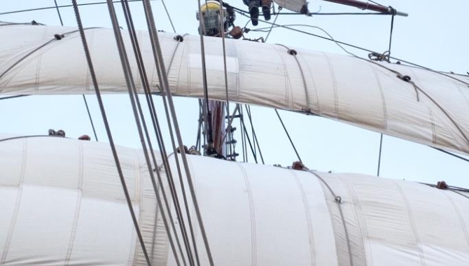 Today we also discovered a tear on the Fore skysail, so better unbent it and bring it down for repair before the gash gets larger. After diner, during sunset, Krista is busy up the rigging bringing the sail down and during the night the stitching sessions continue in the library.