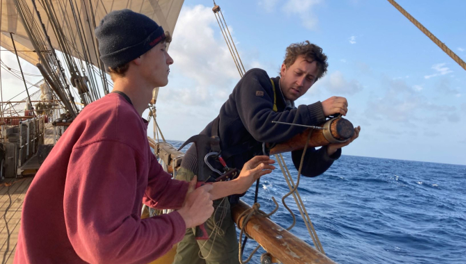 Soon life on board fell back in its trusted routine. Among the first things that are worked on is the preparing of the studding sails, the additional “side-sails” you see on photographs. We will probably be needing them considering the mere eight knots of wind that are being forecasted in days to come.