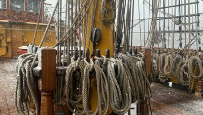 Back on the watch system today and crossing the Drake. We have two of the team on look out and two on the helm whilst the rest of the watch members waiting in the deckhouse. Bark Europa has done some under sail and some under engine depending on the wind. The weather is currently sleety, snowy and there’s a cold wind alongside the fairly choppy seas.