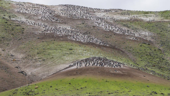 Rounding the rocky cliffs of Baily Head we access a wide open space gently sloping to several hills in the background. There, tightly packed colonies are scattered throughout the volcanic landscape, including some of them occupying the higher ridges, making us wonder how come they choose to breed so high up the mountains, far away from the sea.
