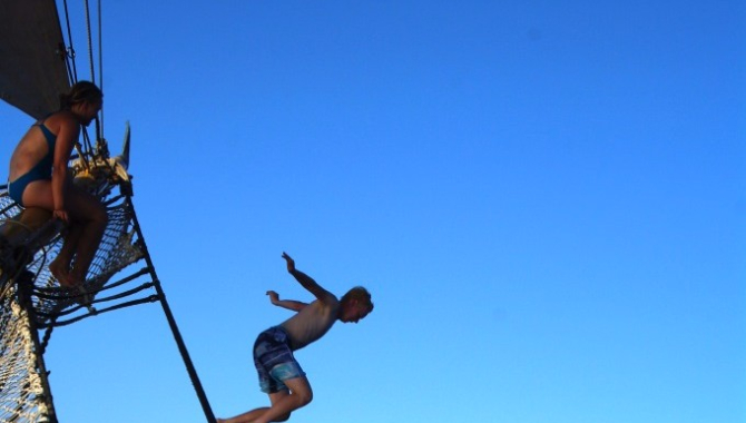 "Oh, en gister, als ik nog een tweede moment mag geven, ben ik van de boegspriet gesprongen. We gingen weer zwemmen. Ik zou willen dat we dat elke dag konden doen. Het voelde echt als een eindeloze val zoals ik die in mijn dromen wel eens heb. Ik deed mijn ogen dicht en wachtte en landde heel hard op mijn billen. Auuuww...."