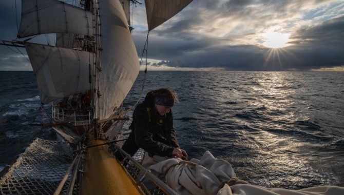 As the day starts, the sun rising on our Portside contrasts with the dark squalls growing on Starboard. From then on, scarred black clouds here and there pepper the horizon, their wry bellies ready to burst with rain and possibly wind shifts. A situation that lasted for the whole day, with the light squalls catching up with us and stealing the sunny weather now and then. Occasionally, rain and a rainbow across the sky as a dark cloud rises on our windward side, announce the moment to bunt-up the Skysails and Stand-by the Downhauls of Flying Jib and Upper Staysails.