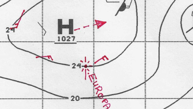 The reason is, that the centre of the High pressuresystem (1027hPa) is still situated Northwest of us and is just slowly moving to the East passing our bow. If that happens the winds will veer and we can shape our course also more to the East.