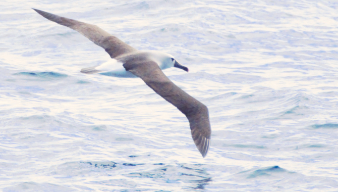 Each has their own personality: the yellow-nosed albatrosses will circle the ship, sticking around for days at a time. They’re bigger than the shearwaters and petrels, but will slink back into the horizon when a larger albatross species glides in. The spectacled- and white-chinned petrels are bolder. They loyally follow the ship’s aft- eyeing the fishing lures. These birds often fly in small groups and mirror each other’s movements in an elegant performance of synchrony. Soft plumaged petrels dance in arching flight, soaring up and dipping down. They’re usually only around when there’s a few other birds already tailing us.