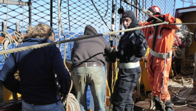 This afternoon we had a great reminder of the importance of safety at sea and how critical it is to react quickly. Around 1400 the alarm rang for ‘Man over board’ and with hearts pounding the voyage crew ran to the decks as previously instructed. At that point we had no idea if this was a ‘real’ situation or a drill. The permanent crew were already in place and sails were coming down at quite a speed. What a relief to see it was a large orange buoy (ed. spotted by the lookout) we were saving and this was a drill to see how well we all responded. The fantastic training of the permanent crew was evident by the way they calmly and professionally instructed us all to take on different tasks. Together everyone worked as a team to ‘save’ the buoy and in less than 15 minutes the buoy was back safely on board. Bark Europa permanent crew are exceptional and their professionalism shines through. In a crisis I would be happy to put my life in their hands, however hope we do not ever have a real man overboard situation.