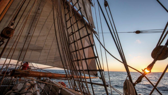 Once the exercise ended, slowly the fair breeze turned to blow more from our aft, making for an almost downwind sail. By that time all the repairs on the fore course are finished and it could be set. With this, all the squares on the fore mast are taking wind with their yards braced almost square. In the main mast just the course and lower topsail can be set, as from there above, the upper topsail yard is still naked without a sail bent on. On this course that is not a problem. Out on deck, while on lookout or steering the ship we soon realise the sudden drop in temperature. The cold areas close to South Georgia and Antarctica are closer and closer every minute, and with water temperatures plummeting from 11º C recorded this morning to the 6º C at midnight we sure are already entering the Antarctic Convergence Zone. Here the temperate subantarctic waters meet the colder and denser Antarctic water mass. In just a few miles wide area, the surface temperature drops dramatically