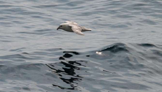 As we sail along, a few elegant Gannets fly over while the numbers of Northen fulmars sighted increase, approaching the ship and seemingly following us with their stiff flapping and gliding flight. Those birds, one of the few species belonging to the tubenose family that inhabits the northern lands (this group of birds include petrels and albatrosses, much better represented in the southern hemisphere), nest between May and September on sea cliffs of the northern seas and wander over the oceans between 40º and 80ºN latitudes.