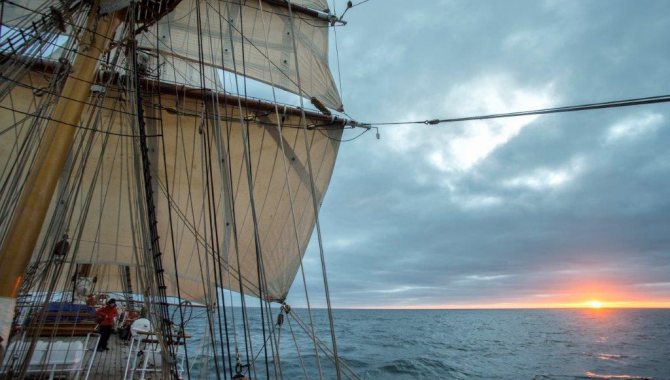Taking advantage of the calm winds and seas, the crew practiced their skills and voyage crew as well, on a Man Over Board drill. Right after our traditional gathering after lunch with the Captain and Guides, the alarm was triggered, and we all took our positions for sailhandling on the respective masts assigned to each watch. After clueing up the Courses, Captain Klaas skilfully manoeuvred the Europa to approach the life ring used as a “victim” and the Sloop (on that case acting as a Rescue Boat) was launched to pick it up, with the two are members Filemon and Will wearing dry suits. All an all the whole manoeuvre took around 9 minutes, not bad for our first exercise of the trip of that a characteristics.