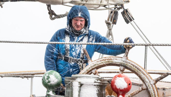 On days like today, there’s time for the crew to do some maintenance today. On a ship like the Europa, an Ocean Wanderer with a hull dating from over a century ago, the jobs to keep her up and running never stop. From the engine room at the aft of the ship to the fore-peak at her bow, passing by her decks and rig, you can always find a crew member busy checking, maintaining, repairing, and fixing. Being as self-sufficient as it can be has been always a characteristic of the ships that spend long periods of time at sea between calls at different ports. Crew with different backgrounds and expertise run the show directed by Captain and Mate. Engineers make sure the stage is wired, connected, lighted, and supplied with water and power, they run the machinery for the broadcast. Bosun produces the results and makes things happen. His precious equipment and spares are stored and ready to be used when necessary in the bosun-stores area.