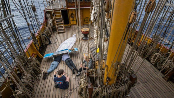 After lunch, a bit of steadier bit of wind allows for trying the manta trawls that are planned every three days. So far so good, the first trawl out of three seems to work well. Then during the second sampling, the ship stops again. The trawl just hangs alongside us. We think to leave it for another day, while the crew pulls on braces again trying to take advantage of the large breeze direction changes. Square, close-hauled, beam reach, and then square again. The six Studding sails come down on deck and are packed. An hour later four of them are unpacked and hoisted again.