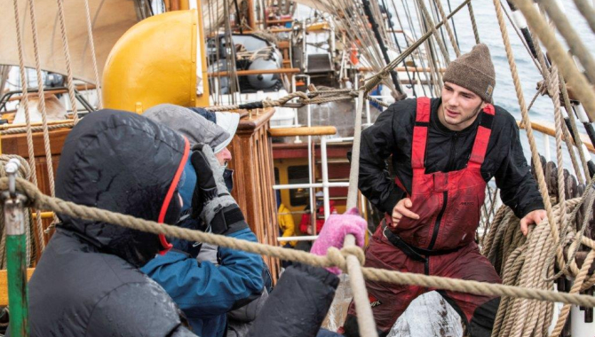 The whole day was characterized by variable winds and weather. The growing swell of the treacherous Drake Passage waters charged their seasickness toll on many of us. Despite enjoying great sailing conditions, not many showed up today, preferring to lay down in their bunks to get over the motion sickness. Some of the people who ventured on deck or actually joined their watches, could be seen carrying the small buckets provided, just in case of a sudden urge to empty their stomachs. By the early morning the wind picked up to 20kn, backing to W-ly again, making for bracing on Starboard tack. One of the several times we adjusted the yard position during the journey. At dawn, about 04:00h, the wind started blowing a steady 30kn, gusting up to 40. Under these conditions it was time to drop and furl the topgallants, middle staysails, outer jib and change the larger Desmond for the smaller aap. Along the morning the waves and swell kept building up on the strong gusty wind. By lunchtime the wind had veered to the NW, blowing a steadier 20 to 25kn, allowing us to set the remaining canvas once again. Adapting our course to the new wind direction we also gradually steer more southwards to keep the ship more stable and at a good speed. We actually could sail basically downwind towards the SE on this condition, but that would increase the rolling motion of the ship and slow us down. Expecting W-ly winds, we will easily bend our course from southbound to a more SE-ly one. The variable weather and wind persist in the afternoon, to the point of running out of it after coffee time. Then the engines roar again, and the crew with the help of a handful of us clew up courses and strike lower staysails. Once the job was done, what it seems to be a squall shows up in the radar, bringing with it increasing winds from the NW. We kept motoring for a while waiting for the gusts to pass, but it ended up being a general regime of wind and rain associated with a low pressure system that sweeps over the Drake. Soon the engines are turned off once more and the sails set again. For tomorrow, this atmospheric system will overtake us, leaving the Europa in a calmer area between weather systems. Steadily progressing southwards from the Beagle Channel, both air and surface water temperature are getting colder. In the early morning it was recorded to be 6.5ºC, but during the day it went down to 4.5ºC, thus indicating that we are getting closer to the Antarctic system, coming from the temperate Patagonian waters. Soon we expect to cross the zone where those two major water bodies converge, creating an oceanographical and biological boundary caller the Polar Front. From then on Europa will be sailing in Antarctic waters until sailing back to Ushuaia in a couple of weeks.