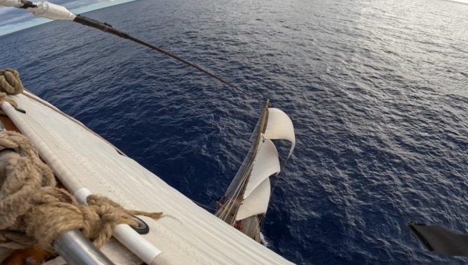 Writing this, our morning sounds like a peaceful endeavor. Doing some trawls, picking out plastic from the sieves under the morning sun, looking at little creatures under the microscope. However, just as the manta trawl entered the water, the decision was made to put the portside studding sails up. The last two days the crew has been busy rigging all the lines, and it was time to bring the yards up. And so, I spend my morning running back and forth from the manta trawl to the fore deck, checking out what they are all doing there. By lunchtime, two studding sails were up, and the manta trawling was finished. The afternoon was occupied by setting the last studding sail and going through all the samples. Somehow Jordi managed to help with the studding sail operation, take photos of this all, and document the activities of the science club at the same time.
