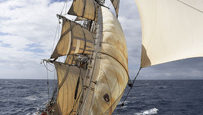 Helming the ship was a challenge – much unlike the dinghies I normally sail where a small touch on the rudder gives instant feedback. Now you give a few turns of the wheel and wait a while to see if anything is going to happen. A squall arrived while I was on the helm. It seemed to lay the ship over a long way. Even the iPad – which gives us the true course – decided it would go from Portrait mode to landscape – while the magnetic floating compass went almost vertical in its gimbals. All the crew seemed unfazed by all this, so I tried to look as if I was unperturbed despite inwardly wondering what was going on!