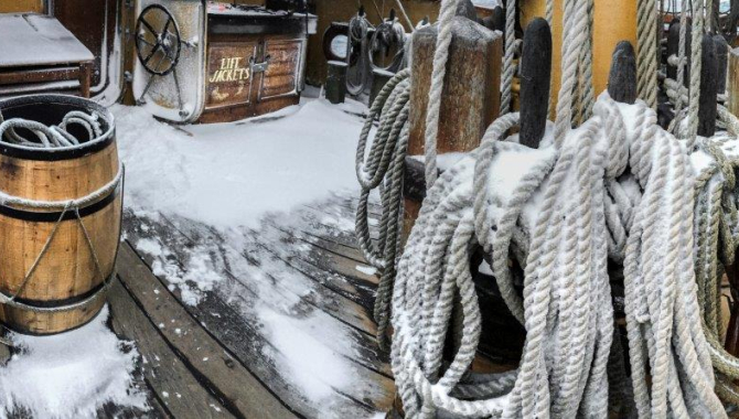 Hands are called on deck to start setting canvas and brace the yards to take the best advantage of the good S-ly winds. Out on deck, the bitter cold had frozen the rig, stiffen the sails and iced up the ropes, to the point of having to deal with rigid coils and icicles growing under the catwalk.