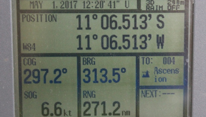 our number in longitude. Shortly before noon, our GPS receiver showed us the curious position of 11°06.513’S, 11°06.513’W. What are the odds of having that position during the trip like this? Well, the odds are not so low and there is a slight chance that we may get that position again during our trip as we move north after our call in Brazil.