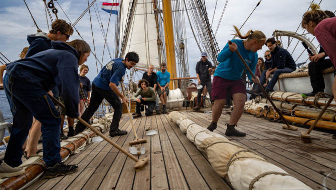 You might by now wonder how Curling is played on a sailing ship crossing the Atlantic, playing at the location 24°34'S 031°43'W. The version of curling we played might be better described as inverted curling where ice blocks, which Sara spent a week making, are sliding over the deck. The goal is to get them on the bull’s eye with minus points being awarded for every centimeter off. This, as is probably no surprise, on a rolling ship quickly leads to rather big minus scores – with the losing team ending with the rather lavish score of -800.
