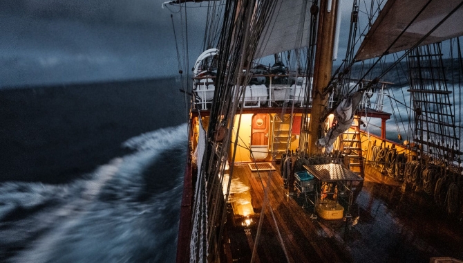 Hello all,POS: 57*08,3 S 065*30,9 WCOG: 353SOG: 6.2WND: W 7 - 8 bftIn the Drake passage. Day 4. Since the early morning we're sailing again! First on a course more East of North, but since late afternoon West of North. That was what we were longing for. The wind picked up during the day. It started with some squalls; royals down, royals up, royals down again...'t gallants down...and then during the watch handover at 8 PM the outer jib and Desmond. That left a perfect rig for this quite squally night. It was the same in daytime, but at least you can see the squalls coming. Now in the dark it feels more like a surprise. The wind-forces are not that high, but it's gusty over all. At the same time the waves gotten a bit higher, which most of the VC like, at least the ones that are not trying to sleep ;-)In the galley they made the perfect rough weather meal, nice pasta. No spicy addition needed today. They had their hands full already to keep everything in place. The after dinner cleaning in these seas is a matter of timing and preparation. Don't put too much water in the bucket and never leave it unattended. Do either one of them and you'll find yourself dealing with a water ballet. Then it gets quite hard to hold on. You might turn into the mob sliding over the floor yourself. Luckily our crew are mega advanced in these situations. Not only acrobats on deck, but also managing the interior of the ship in acrobatic style!Groetjes, Janke