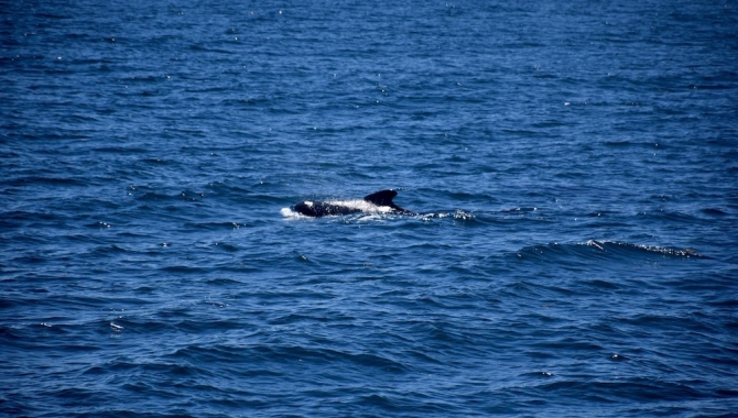 After the thunder and the rain from yesterday today a comfortable warm sun, blue sky's, a light wind and high pressure so stun'sls up on both sides. A good chance to make pictures from the zodiac with groups of pilot whales around us, a small swim stop and with a slight breeze the fading contours of Newfoundland heading for Louisbourg.