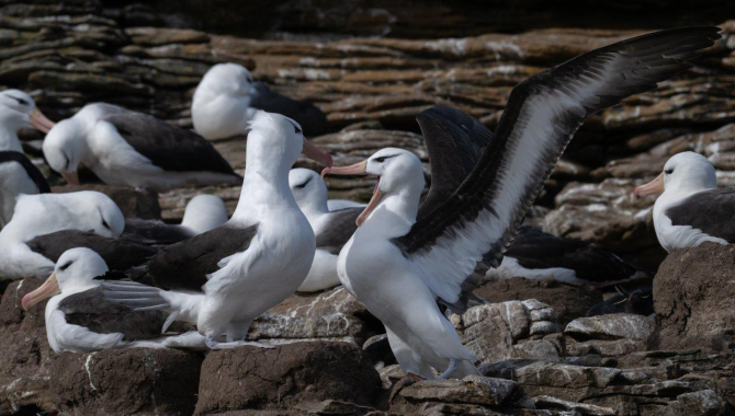 Contrasting with the gentleness of the eastern coast, the exposed west shoreline is the precipitous home for several Black-browed albatrosses and King cormorant colonies, together and mixed up with large rookeries of Rockhopper penguins. A breathtaking sight both for the scenery and the tame wildlife, which we can approach until a well-marked delimitation perimeter by the locals, who accompany us during the visit.
