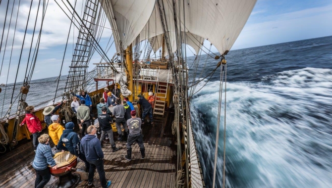 Warmth and good weather are broken up by occasional passing showers and their associated wind shifts upon a now fair Northwesterly that has taken over the light airs of the start of our voyage. Awesome and fast sailing on an easterly course, and a weather that allowed for daily sessions of sail training for the Voyage Crew, easy going sail handling and good practice time on deck and aloft.