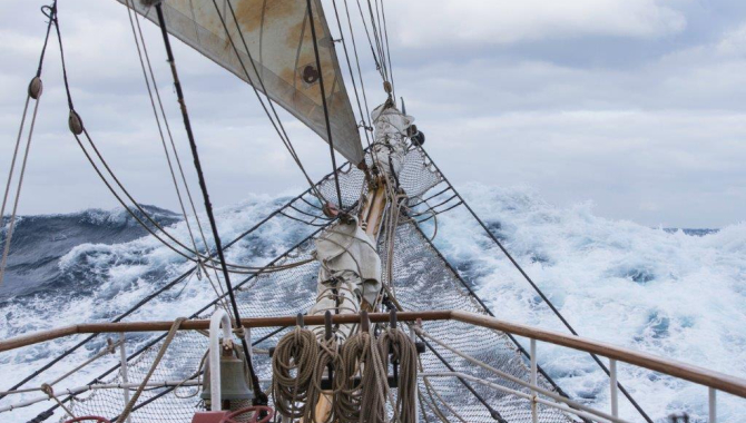 Hale, snow and rain showers keep passing by in the morning, easily spotted by the lookouts as black clouds in the horizon rapidly approaching us. Those showers, brief but with heavy winds associated in a concentrated zone, are also identifiable in the wheelhouse radar, giving a bit of time to prepare ourselves before they hit us. Like this we end up clueing up and furling Main course and Top Gallants, together with the Mizzen Topmast Staysail. The many squalls and their associated change on sea and wind conditions, made for a more unstable and variable weather, giving us a minimum of 20kn steady breeze up to strong 45kn, blowing S-ly to W-ly. Our course alters accordingly from 60º to 90º, and actually, due to all the windshifts and while riding considerable big swells, steering is taken by Mate and Captain from the wheelhouse, not to be passed again to voyage crew until late in the afternoon, when we ride more before the wind. On that situation hands are needed on deck once more to drop the Dekzbabber, set the Main Course and the smaller Aap over the main deck. On more stable wind field, when less menacing showers seem to approach us, Top Gallants are unfurled and set again, just before dinner starts. Night-time falls and with it brings another wind shift, now starts to blow more W-ly or even veering to W by N. To keep steering straight to the northern shores of South Georgia is time to call the watch on deck and make a new jibe after receiving the proper instructions.
