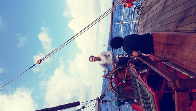 After creeping through the doldrums, we finally got some SE trade winds. Our Voyage Crew is thoroughly drilled and had the sails set in no time. Turning of the engine was a relieve. Finally the Ship was under a healthy heel again and clipping along nicely.