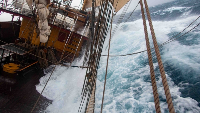 Ayden, the birthday boy, had woken up to a birthday surprise. As he dragged himself groggily from bunkie to bathroom, a plume of water erupted from the vent and flooded the small room, giving a new meaning to the term, ‘water closet’. This commotion forced Clara to abandon the porridge and check that no other, less waterproof areas had flooded. Luckily, it was only one vent on the main deck, hidden behind a mooring line, that had been left open. After profuse apologies, it was decided that this was a rather funny start to Ayden’s birthday morning. The commotion of the morning was soon explained when we ventured out onto the poop deck. Harnesses on, oilskins already leaking, we were greeted by the long-promised, much-dreaded depression.