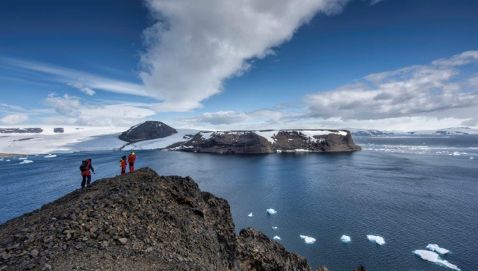 The Erebus and Terror Gulf welcomed us with variable but good winds after our landing at Paulet Island. Setting Topsails and Dekzwabber we could sail almost all the way until reaching the north coast of Vega Island, where the smaller but beautiful Devil Island is nested in a wide bay. During the sailing we could enjoy the glaciated scenery and the islands and coasts around us. One of the most eye catching island we pass by is the typical Rosamel. With its circular shape, it is just 1nm in diameter with precipitous cliffs of volcanic rock rising to a snow-covered peak 435 m high, lying in the middle of the Southern entrance to Antarctic Sound. In a few hours of nice sailing we arrived to our destination, where after scouting for a while trying to find a good place to spend the night, our mate Jelte dropped the anchor in what turned out to be a perfect spot, sheltered from the prevailing N-ly winds and from the large drifting icebergs, that stop their way on a shallow bar. Pretty scenic as well, South of us we enjoyed the views of the large glaciers and mountains of Vega Island, on the opposite side of the sound, Devil shows its desert appearance and the two mountain tops, like the devil’s horns, that gave its name to the Island. A good night at a anchor promised a good sleep after the few drinks taken for the very successful South Georgia Auction that we did in the afternoon. And so, by early morning all was ready for our landfall at this fantastic spot, home of Adélie penguins and with great hiking chances. As usual, following a good scout of the area by our guides, we were called to start operations. Sunny weather, blue skies adorned by some high clouds and windy conditions welcomed us to the area. On land, we set foot on a little volcanic beach at the foot of a steep snow field leading to a plateau. An easy short walk through the seemingly barren land of the south of Devil, lead us to the saddle between the two peaks of the island. From there the panorama changes radically as the views we get are over the open waters of the Weddell Sea, James Ross Island at the background and the lower slopes of Devil covered by nesting Adélie penguins. Descending towards the rookeries, we spent a while watching the evolutions and doings of the inquisitive penguins, many of us delighted to see some of the recently hatched chicks. Until now, in the rest of the Antarctic colonies visited during the trip, the penguins were still sitting on their eggs. Here the little chicks were already demanding their first meals regurgitated by their parents, under the attentive eye of hungry Skua’s. From there our guides proposed to walk up the peaks of the island, the Western one representing an easy way up to a superb lookout point, the Eastern top being more difficult over a narrow rocky ridge. Both peaks are fringed by basalt cliffs on their north facing side creating an amphitheatre effect on the north shore where the penguin colony is located. The peaks slop off to the south where our landing site is located. Wonderful morning in this remote and isolate place amidst the emblematic islands of the northern Weddell Sea. Next was to heave anchor and start moving northbound to the Antarctic Sound, to try our luck for a landing at Brown Bluff, a spot located on the east side of the Tabarin peninsula, in the Antarctic continent itself. Before that, our way took us through the scenic Fridtjof Sound, leaving at our Port side the vertical front of the glaciers that cover that northern area of the Peninsula, and at our Starboard side Andersson and Jonassen islands. After this impressive passage it was not far until reaching the windy shores facing Brown Bluff. While having an early dinner, as the plan was for a landing after the meal, Europa drops anchor under the towering rust-coloured bluff flanked by vast glaciers. In front of us, right under the cliff extends a 3.2 km long beach of rock and volcanic ash, which provides adequate terrain for Adélie and Gentoo penguins to nest. Since the moment the anchor went down, the ship started dragging under the strong winds, gusting over 30kn. Luckily the usual concentration of icebergs and sea ice that often guard the open bay, where not there, and we got space enough to drag away from the treacherous shallows located close to shore. While the captain struggled to keep the ship in a good position, our guides take a zodiac to scout the conditions and the chances to set foot ashore. Wind and waves splash wildly over the boat as soon as they start their way. They made it all the way to the landing spot after a rough ride, just to realise that breaking swells crashed over the brash ice along the coast. Assessing the situation ashore, increasing gusting winds by the minute, wild zodiac ride and difficulties to properly anchor the Europa, soon the decision is taken to cancel the evening activity and start our way out off the Weddell Sea, first through the Antarctic Sound, then across the Bransfield Strait towards the South Shetland Islands.Under variable winds blowing while the sun sets, the dekzwabber is set before bracing sharp on port tack, helping our engines to get us along the sound. Being 11-19 km wide, it runs in a NNW-SSE direction for 53 km. It separates the extreme NE of Trinity Peninsula from Joinville Island, D’Urville Island, Bransfield Island, and Dundee Island. Dumond d'Urville first sighted its northern entrance during the French Antarctic Expedition during 1837-1840. Nordenskjöld's Swedish Antarctic Expedition (1901-1904) navigated and charted the sound. They named it as 'Antarctic Sund' for Carl Anton Larsen’s ship 'Antarctic', which, in 1902 became the first vessel to sail in this sound, and was crushed by the ice the next year.