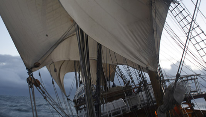 In the evening, just after dinner, we all meet in the deckhouse. We are still close to Isla Nueva, but slowly we will be leaving the protection of the islands and are entering the open waters. Not just some open waters, but one of the stormiest seas in the world, the passage between South America and Antarctica. We are heading out on the Drake and will be out there for some days. Almost 500 miles of sailing – we´ve done 90 so far today. Coming from the North, the Drake offers some very strong currents in the first 100 miles, flowing from West to East. As they pass the narrowest part, the Southernmost islands and round Cape Horn, the current turns back into the open waters and creates some interesting phenomena, like eddy currents. We are now at this part of the confusing sea – movements are sometimes surprising, and it will not be long until the first famous buckets start to appear. Strong and nice winds blow during the night. Every now and then a squall passes by, bringing rain and a sudden 40 knots of wind. Almost all of our sails are up – last evening we have added the two courses and our speed has been constant between 9 and 11 knots – with an impressive maximum of 11.5 knots. As a comparison; the average speed we hope for or count on when making the schedule is 5.8 knots. We are expecting less wind, things will change for sure, but for now we are enjoying a very good stretch of sailing. All fine - the Drake is treating us well.