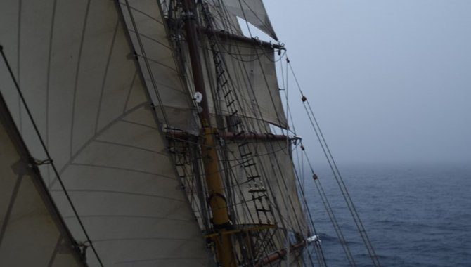 Back in our sea watches, we are all awake and asleep at different times. From midnight to noon we have sailed 80 miles – partly on engine, but mostly under sail. We are heading to the North West, soon reaching the Pacific. Around 14 we are making a good speed of about 7-8 knots. The winds are forecasted to turn more to the West, which is perfect looking at our course now. A depression is passing, but perfectly slow and far enough in the North. The ship is very silent today – everyone seems full of impressions after Antarctica. All possible places to take a nap are taken. During the evening the wind drops down a little. We are heading in the good direction, with a good speed with a stable tack. It is a little wet outside, fresh and rainy, but no bad weather to speak of. The Drake is treating us well.