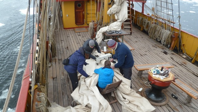 Yesterday the sewing machine was positioned on the main deck. A enormous piece of sail cloth on both sides; itlooked like a waterfal. Katelinn, one of the crew was sitting behind it and between all the cloth she was barely visible. Six gloved hands were helping her keeping the sail in place. The sail needed new stitches. Quite a heavy job.