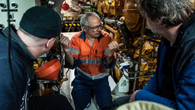 In 1720 Brockes became a member of the Hamburg senate, thus the old name of the Bark Europa. In 1986 what was left off the ship was brought to the Netherlands and during 8 years she was refurbished and rigged as the three-masted bark we are sailing today across the South Atlantic. Not just her rig was completely changed but also she was equipped with modern sailing equipment, berths, toilettes, fuel and water tanks, fridges and freezers, and all what makes her what we can experience nowadays, including two Caterpillar 365hp engines. Today we got the chance to visit all the areas below decks normally off limits for all of us, including the engine room, accompanied by our engineers Trevor and Greg. On her elegant way through these waters and today without the help of those engines, Europa has sailed 191nm at an average speed of 8kn during the last 24h. Following a proper routing to Cape Town, counting with winds and currents fore-cast, still 1157nm lay ahead of us.