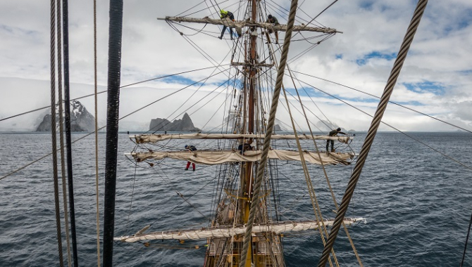 Back on board, katabatibc winds continue blowing. Anchor is heaved and crew starts preparing the ship for the sea days to come. Safety lines are tied and safety nets are stretched along the ship at the Main deck. As the ship gets some distance from the rugged coast, wind starts dying down. Time for climbing aloft and unfurl some canvas. Top sails first, then Top gallants, Lower staysails, all the head rig and Middle staysails too, soon they try to catch the light breeze left offshore at the shadow to the island.