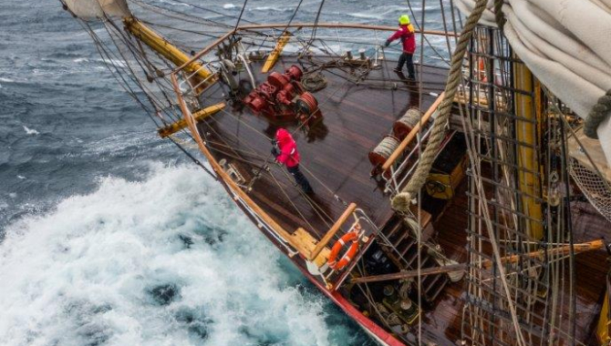 Fog, reduced visibility, and careful navigation amongst the ice, were situations which we also experienced during the last days as we approached Antarctica. Once the misty weather lifted, today there were still more hardships to overcome until we were able to see the Antarctic territory. Furious and tempestuous winds, stormy weather, raging gusts just about the 50kn. Steering and Sailhandling into this angry Weddell Sea wasn’t the easiest, first to make way under reduced canvas, later on just using the Lower Staysails and a couple of headsails. At some point, the engines are turned on to deal with some tight spaces amongst the ice.
