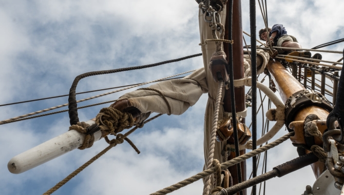 Days of preparations are needed beforehand for such jobs as overhauling the yards and masts, bending on the sails and rigging all the extra lines and blocs aloft. Then the masts have to be fitted at the very top of the rig. The whole yards with the sails bended-on follow.Down below, other crew members are busy in other tasks. Scraping, sanding, varnishing or oiling still is on the go in handrails, booms, wheelhouse and pinrails. Indoor preparations for welcoming new guests are almost finished, while engineers can be seen emerging now and then from the ship’s dungeons maintaining the ship’s systems for power, propulsion and water.