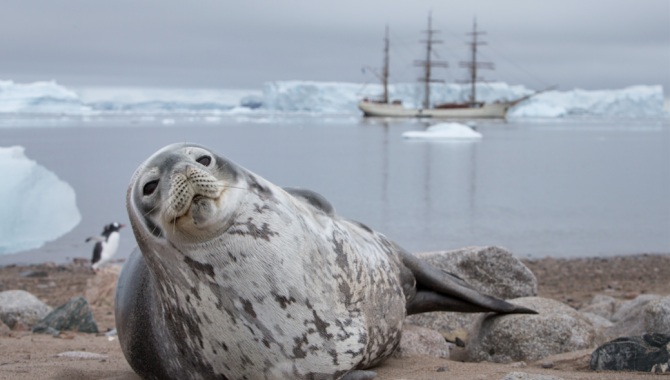 We are sailing into the Nelson strait – the strait between Robert Island and Nelson Island. On both sides we see large, snow covered glaciers, some of them ending in bright blue fronts coming down to the ocean. We sail Southwards through the strait, until it is time to take away the sails and put on the engine. We are now heading East, and later more North, into Maxwell bay. We are here to bring Mateo to the Chilean base at King George Island. Also, we will do our first landing.