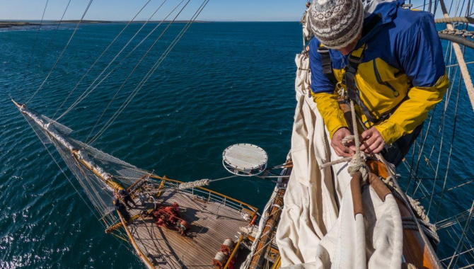 The afternoon ahead was about to be a different one. Relatively sheltered from the persistent and quite strong northerly winds that blow out at sea, the idea was to spend some time here and finish the instructions and familiarization that started yesterday before hitting the rough weather. Soon we gathered on deck for an exciting familiarization to climb the rig. Harnesses donned, lanyards ready, and after carefully listening to the coaching by the crew, up the shrouds we went to the first platform. Different people with different levels of success, though, but nevertheless a thrilling experience for all. Many will surely repeat soon, further learning how to give a hand to the crew furling and unfurling sails. Training didn’t have to wait long, as in the late evening, some helped the permanent crew up the yards to pack away the sails that we used during the afternoon sail. Straight away after finishing these climbing instructions, the anchor came home, and we started setting canvas on our way towards the next destination, Barren Island.