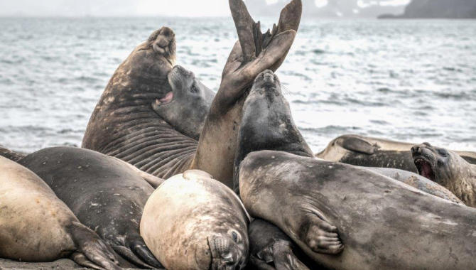 After a night holding anchor at Half Moon, early in the morning we pick up the 4 shackles of anchor chain and start our way towards the dramatic rocky peninsula of Fort Point. Located at the Eastern shores Greenwich Island, its crags crown a flat and narrow boulder peninsula that sticks off the large glaciers that cover the island. Poorly chartered waters surround this spectacular site, together with its exposed orientation to the open waters of the Bransfield Strait makes of this place a gemstone seldom visited. Setting foot ashore always involves a difficult operation, including surge at the beach and the need for the guides to wear dry-suits to ensure safe and swift landing manoeuvres. Before breakfast Europa drops anchor close to the Southern coasts of the peninsula, where the swell and breakers seem to be easier and lower than the opposite coast. Anyway the spectacular and unique setting of the area and its inhabitants are worth a wet landing over the breaking waves. From Fort Point Europa make her way along the southern shores of Livingston Island towards our next destination, distant 42nm, that will represent an arrival time in the late afternoon and an evening landing at Elephant Point. Before diner we already drop anchor in the uncharted waters in front of Elephant Point, another seldom visited spot of the South Shetland Islands. Looking at the beach, our landing spot will be right next to a conspicuous square basaltic pillar guarding an extensive flat beach. This site is also relevant for the early history of Antarctic discoveries, strongly related with sealing and whaling. It was first charted and named by Robert Fildes in 1820-22. From this point and further West to Byers Peninsula (that forms the western tip of Livingston Island) many concentrations of early 19th Century sealers relics and remains from whaling operations can be found. And indeed, scattered over the large landing area, whale and seal bones, wood from old refuges and one of their impressively well-preserved stone hut. Still with the whale vertebrae used as stools and the whale ribs piled up ready to be used as a protective roof, it gives us an idea about the harsh lives of the people who worked here in the grueling sealing industry of the 19th Century. But first we were all surprised by the large amount of moulting Elephant seal haul-outs to be found in the area, a clarifying sight to understand the origin of this place’s name. Mostly males can be found here at time of the year, in groups comprising individuals from different ages. Some of them just pups born a couple of months ago, others counting with larger animals. the area offers a combination of open spaces and zones completely crowded by wildlife. Even one of the rocky outcrops next to the beach is home for several pairs of Giant petrels, from which we maintain a good distance as normally they get easily disturbed. Amongst them a few White morphs can be seen, looking smart with their almost completely white plumage, in comparison with their greyer or brownish congeners. Soon it became close to 22:00h, when we all have to be off the beach to respect a daily period during the night when no ships are allowed to land, leaving the land for their true inhabitants.