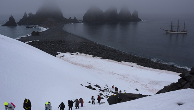 Early in the morning we leave for Fort Point. Fort Point is a narrow isthmus at the Southern end of Greenwhich Island. It is a little foggy and slightly humid, as so often in the South Shetlands. The landing site is quite steep and there is enough swell to potentially flood the zodiac. Matthew and Sarah are dressed in drysuits – to hold the zodiacs while everyone is getting out. Or is it to be able to float around and have a closer look at the penguins? Certain is that the amount of jumping penguins increases drastically when they are floating while waiting for the next zodiac. Once everyone is on land we take some time to explore the rocky land spit. To watch the Gentoo and Chinstrap penguins and their chicks – and find a single macaroni between them. The other side of the narrow bit of land is ending into a high and in this weather remarkably blue glacier front. The waves in the ice filled sea splash against the larger bits of the glacier.From the glacier front we climb up through the snow to reach the nunatak – the black rock sticking out of the glacier, around which the ice has melted. We climb for a while before we stop and sit down; we have a splendid view out over the land, the fog and the Europa anchored below us. The top of the rocks that gave name to this place – the rocks standing out in the ocean like a castle, a fort – are partly covered in fog. Large patches of the snow beneath us are covered by green and red algae – strangely colourful in the otherwise monochrome landscape.(...)Arriving to Hannah Point – most of us decide to come out on the evening walk as well. The landing site is packed with mostly Gentoo penguins. Parents and chicks almost the size of their parents walk around in all directions. We know we will be divided into smaller groups and stay close together, and we know this sight has been closed until just a few days ago exactly because of all the nesting penguins, but still it is impressive, almost intimidating to be so close to the nests and the adults with their big chicks. It has been drizzling for a while now, and all of them look muddy and wet. After walking extremely careful for a while, we come into a more open area and continue our walk between the penguins. Even after just a few days out on the open ocean and in the pale landscape, the place seems intensely green – Prasiola Crispa is flourishing higher up on the hills. From Hannah Point we walk to Walkers Bay – passing an enormous pile off Elephant seals, and than leaving the busy and crowded area behind us we enter a black landscape of volcanic rocks and ashes. The only colour here are the strong greens of the Jasper stones, small and larger rocks spread out over a 30-40 meter area. We walk past young elephant bulls fighting or practicing to fight.After the narrow path opens up into a broader beach. Under an enormous rock a small collection of fossils can be found – apparently collected by a group of scientists that installed them their as a museum like display – for those who know. The fossils of plants and leaves tell stories of different times, a time that the continent was still on another latitude, part of the ancient super continent Gondwanaland. It broke up a 180 million years ago, after which the land that would become the Antarctic started drifting South. Fossils found in Antarctica were in fact the basis for the theory of continental drift.It is starting to get dark again, and time to get back. Compared to our rough landing yesterday – this landing is out of limits. Better to call yesterdays landing calm. It is a long and wet way back, but the ship is warm and the bar is well stocked.