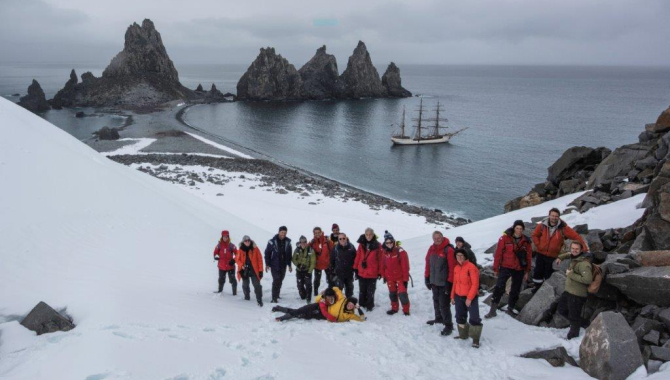As a big difference with yesterday’s night fierce windy conditions along the southeastern coasts of South Shetland Islands, last night’s calm weather allowed for a calm transit between Deception Island and Greenwich Island. For 45 nm we motored our way on the gentle swell, just to arrive before breakfast at Fort Point. Its dramatic rocky point, leads along a narrow flat isthmus towards the glacier fronts of Greenwich Island. Open to the Bransfield Strait whimsical sea conditions and winds, is an exposed and rough place, often representing difficult landing circumstances. Due to these facts and adding the inadequate soundings and charts of the area, Fort Point is seldom visited, but is now becoming a traditional spot for bark Europa. North and South sides of the isthmus were scouted before taking a decision where to anchor and where could be the most suitable place for a landing. Depending on the wind situation and sea state, it is often possible to land here, in one or the other beach. Seeing our guides dressing in their dry suits gives us a good guess of the landing characteristics. Care must always be taken here due to the trains of waves breaking at the steep rocky shore, but the unique setting of the spot, spectacular views and the amount of wildlife is worth a wet disembarkation. Being a relatively small area, during the morning we had time enough to soak into the wild beauty of the spot. The glaciers covering Greenwich Island here reach the sea level, and between two of their fronts stretches a boulder beach out towards the ocean, crowned at its end by high jagged basaltic cliffs. At their feet and along the flat accessible areas of the narrow stretch of land, thousands of Chinstrap and Gentoo penguins find their nesting grounds. Amongst them, usually a Macaroni penguin couple hangs around. Today it took to the very end of our time ashore to distinguish one walking amongst the numerous Chinstraps. This species is observed seldom in Antarctica, and as we know from our days at South Georgia, the Macaroni is in fact a South Georgia species. Once we all got a good look at the only Chinstrap penguin colony that we visited during the trip, it was time to spread out a bit more, first walking along the cobble spit towards the imposing glacier fronts that frame the isthmus. The sight is quite impressive, with a massive icy cliff next to us, battered from time to time by the large swell breaking at the narrow boulder beach beneath it, creating a spectacle of untamed beauty. For the ones seeking for a bit more morning adventure, our guides now walk towards another of the feature highlights of Fort Point, a “Nunatak” sticking out off the ice field that flows on either of its sides, and ends up with the two glacier fronts over the ocean that we just visited. The rocky mountain with nearly vertical cliffs on all its sides shows itself as an island amid the ice field. The dark rocks, once they get free of the ice covering them, get warmer than the surroundings and gradually melt a space between them and the ice, leaving room enough in-between for all of us to fit in. Perched above rocks and ice, the viewpoint is fantastic. From there we all admire the stunning raw scenery with its unique Antarctic appeal. Soon our last landfall in Antarctica was reaching its end and it was time to start getting back on board. Engines should start shortly after embarkation not to lose time to get into the Drake, en-route to Ushuaia. Like this, after a quick setup of the ship for open oceanic water sailing, there she goes once more. First motoring her way along the English Strait, leaving Greenwich Island at our Port side and Robert Island at our Starboard. A lonely Minke whale pays us a visit while Europa approaches the small Aitcho archipelago, that marks the Northern entrance to English Strait, and for us, the beginning of the infamous Drake Passage. We are welcomed to its waters with West-by-South fair winds and relatively low swell. The time that our beloved Europa was waiting for had come, and after the crew unfurl almost all our canvas and set it, she happily awakes once more, sailing at 8kn to a maximum speed of 10kn on a NW-ly course. Just the higher Staysails and the Gaff Topsail remain furled, but before diner, under slightly increasing winds over 30kn, Royals are clued up and stowed away. We keep this configuration since then, having a great and fast sailing on a close-hauled point of sail, on port tack, just with slight course changes when the wind seems to veer and back a few degrees several times during the night.